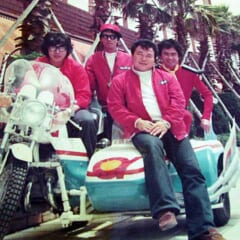 バイクの師匠になる青山敦夫さん(バイクにまたがってるメガネの人)。東映の映画やTVのスタントをやっていて、自然とそれを手伝うように。