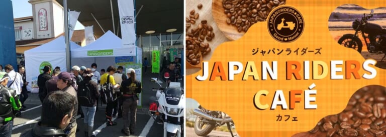 若年層のライダーと二普協の接点になるようにと、今年から開催しているのが「JAPAN RIDERS CAFE」。ツーリングの途中で立ち寄って、ホッと一息つける場所を提供している。上左写真は4月14日に奈良県の針テラスでの開催風景で、450個用意した参加記念品をすべて配り終えたとのこと。開催情報は「ジャパンライダーズカフェ」で検索を。
