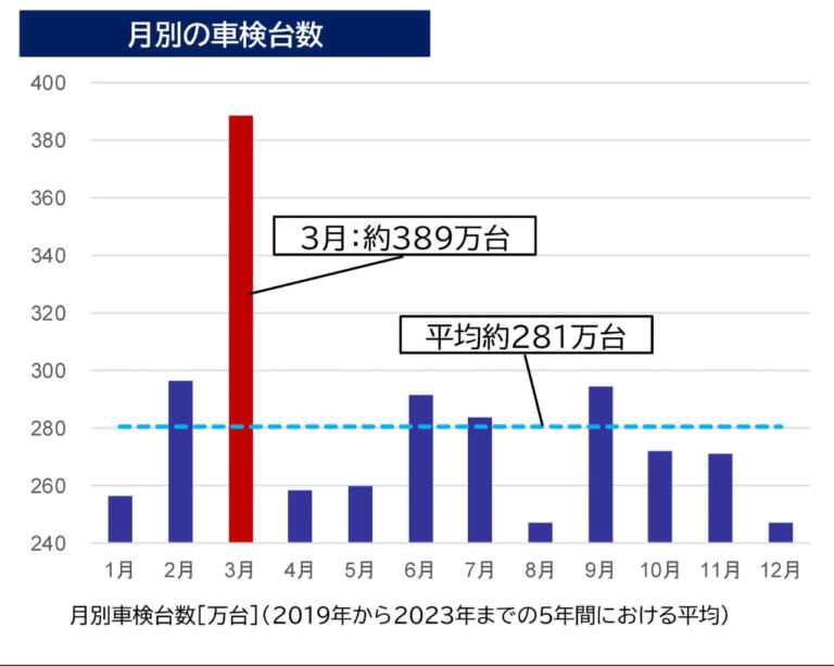 国交省によれば、月別の車検台数は平均約281万台だが、3月はなんと約389万台に。数が少なくなる5月/12月が250万台を割り込むのと対照的だ。