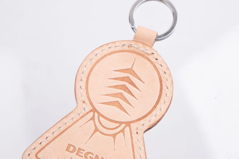 てるてる坊主をモチーフに目玉マークを組み込んだ、5色展開のレザー製キーホルダー。