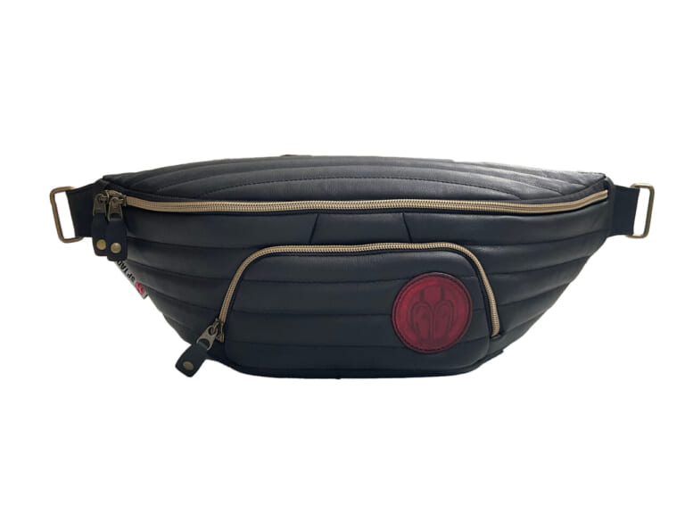 シンプルなレザーウエストバッグのアクセントに赤のエンブレムを用いた。近日完成予定だ。