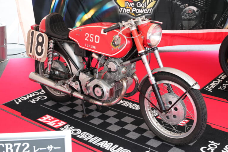 吉村不二雄さんがデモランしたCB72レーサー。ポップ吉村が手掛け、1964年に鈴鹿8耐の前身である18時間耐久を走った伝説のマシンだ。