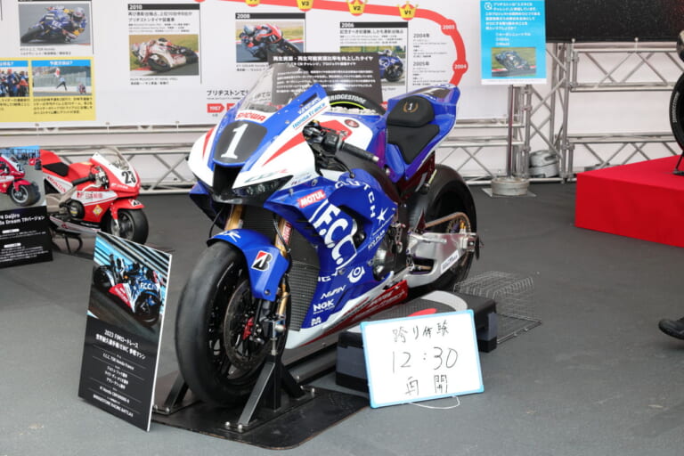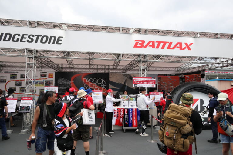 ブリヂストンブースにはタイヤウォーマー体験コーナーも(触ると熱い!)あった。