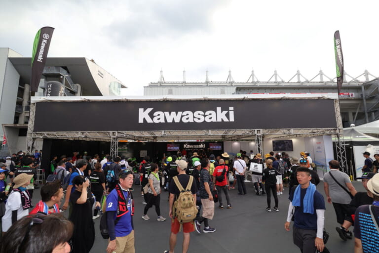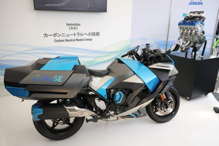 水素で走るモーターサイクルやハイブリッド、EVを展示して賑わうカワサキブース。ファミマカラー(?)のニンジャZX-4RRもあった。