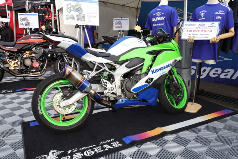 アールズギアは最新ニンジャX-4RR用マフラーなどを出展。