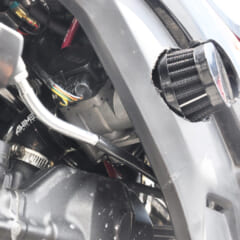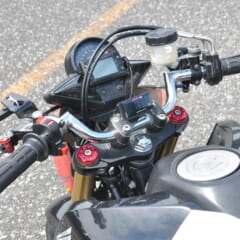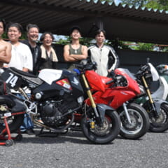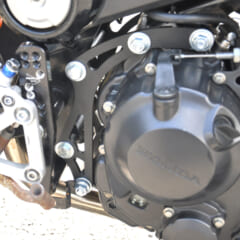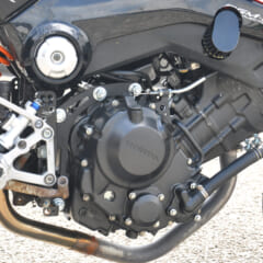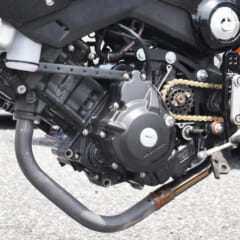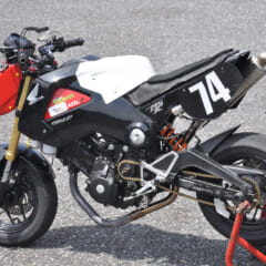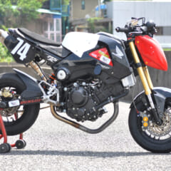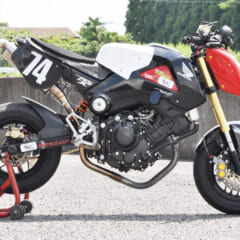 初代グロム(JC61)に、CBR250R(MC41)用の水冷単気筒をスワップ。車体に対するエンジンの大きさはおかしいものの(笑)、割と違和感なく収まっている?! 車体はJC61のスタンダードだが、フロントフォーク内部パーツとリヤショックはシフトアップ製のパーツでグレードアップされている。