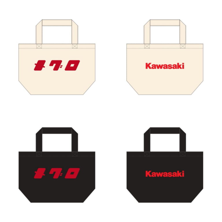 【カワサキ キャンパストートバッグ(メグロロゴ)】キャンパス地のトートバッグ(小)。ナチュラル、ブラックの2色があり、メグロのカタカナロゴプリント入り、裏面にkawasaki(赤)ロゴ入り。 ●1650円