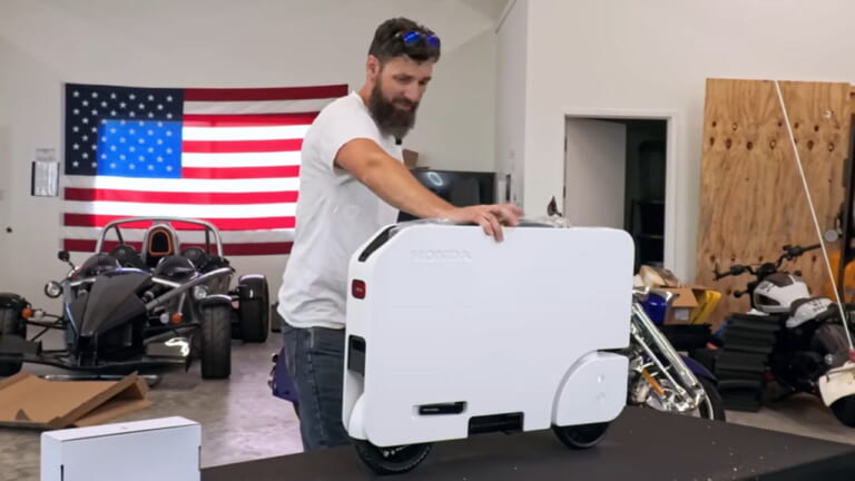アメリカの人気YouTubeチャンネル『Bikes and Beards』がホンダのミニマム電動バイク「モトコンパクト(Motocompacto)」を購入して乗り回す! 地下鉄から飛行機、ショッピングセンターではエスカレーターも利用して移動しまくります……。