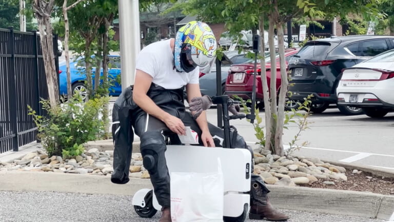 とりあえず自立するように変形させてからマニュアルを読んで、そして充電。私有地をノーヘルで走ったあとはフル装備で公道へ。州によって法規が異なるアメリカなのですが、モトコンパクトが車道や歩道を走り回る姿は日本人の目からは違和感しかありません(笑)。