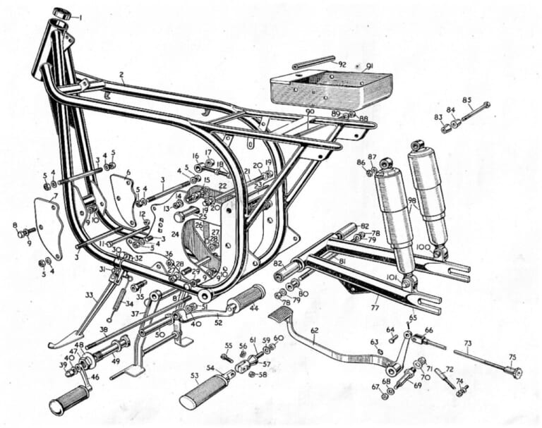 パーツリストから転載したノートン製フェザーベッドフレームの図版。ただし、これはレーサーのマンクス用ではなく、ストリートモデルのドミネーター用。