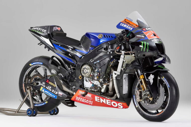 2023 YZR-M1:近年のMotoGPレーサー/スーパースポーツのツインスパーフレームは、ヘッドパイプ付近から左右下部に大きく手を伸ばすかのような形で、フロントエンジンマウントを一体成型している。
