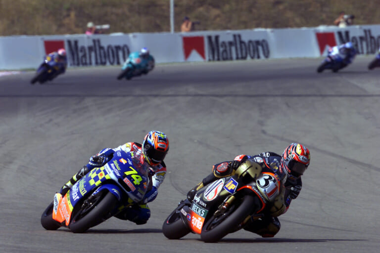 2001年チェコGPにて、加藤大治郎選手と競う原田さん。このシーズンのチャンピオン争いは2人だけの世界を展開したかのようだった。