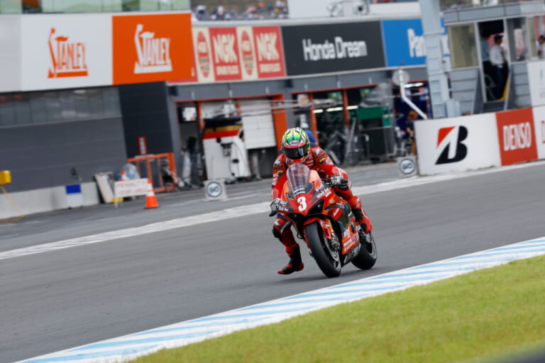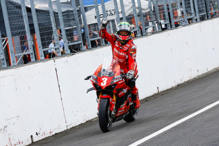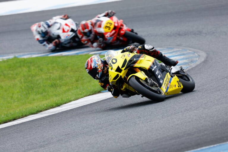 ドゥカティのファクトリーPanigale V4Rを持ち込み、当初は走らせるだけで精一杯というところからスタート。そんな状態ながら表彰台に立ち続けた水野は、前半戦を終え、鈴鹿8耐に参戦したことで、事前テストを含めて走らせる時間が長かったことが、チームとしても水野としてもドゥカティをより理解することにつながりました。鈴鹿8耐を終えた時点で、後半戦に向けて良い経験になったと語っていましたし、その最初のレースで見事に有言実行を果たしました。この勝利で一気にDUCATI+水野に流れが傾くことになる可能性は高いでしょう。