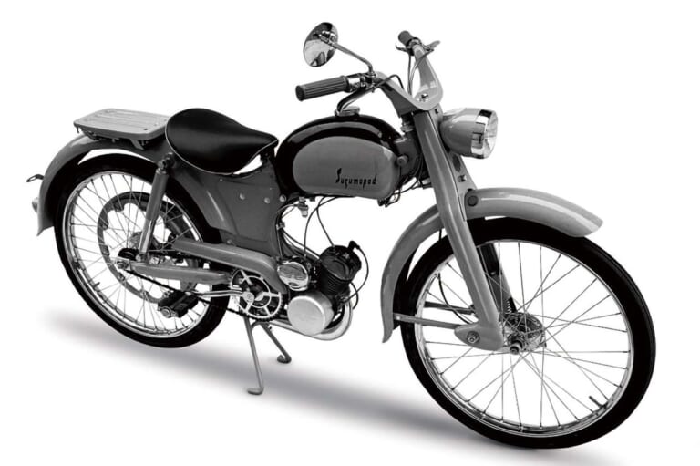 【スズモペットSM1】1954年に発売された自転車用補助エンジンMF型(ミニフリー号)をプレスフレームの車体に搭載して50cc完成車としてまとめたもの。50cc空冷2サイクルエンジンの出力は2.0ps/4500rpmで変速機構はない。クラッチ操作でエンジン駆動とペダル駆動を切り替えることができた。前輪にボトムリンク式、後輪にピボット式の本格的なサスペンションも装備。二次駆動に当初はチェーンではなくVベルトを採用していた。当時価格は4万5000円。