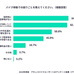 予約制駐車場でお馴染みのアキッパ(akippa)。同社が8月19日の”バイクの日”にちなんで、過去に車種「オートバイ」を選択して駐車場を予約した全国のバイクユーザーを対象に、アンケート調査を実施(有効回答数268)。本アンケートは毎年行われているが、今年も困りごとのトップは「目的地にバイク駐車場がない」というものだったという。 目次 1 困りごとのトップに来るのが”駐車場不足̶ […]