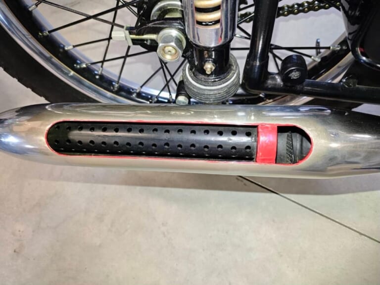 キャブトンスタイル(カワサキはピーシューターと表現)のマフラーは、往年のメグロジュニアS8の音質を参考にしながら、こだわりのストレート構造はS2を手本にしたという。パンチングの数や密度、管の内部に設けられた7穴のプレートなどによって気持ちのいい抜け感ある音質を作り上げた。