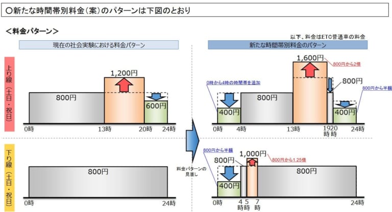 上り線の料金は、混雑時を1200円から1600円に引き上げるとともに、20時から翌朝4時までは400円に、1200円だった19時から20時を800円に引き下げるほか、現在は終日800円(普通車・二輪は640円)の下り線の料金も5時から7時を1000円(二輪は800円)に引き上げるほか、0時から4時までを400円に引き下げるとしている。