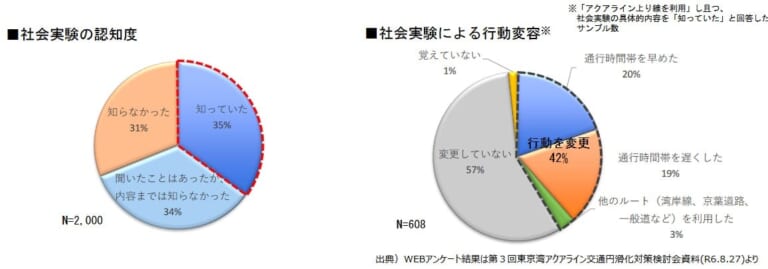 アクアラインを利用して南房総地域を訪れた千葉県外在住者の社会実験の認知度は69%で、具体的な実験内容まで認知している方は35%。認知している方のうち、通行時間帯やルートの変更を行った方は42%、目的地に長く滞在するなどして通行時間帯を遅くした方は19%にとどまっている。