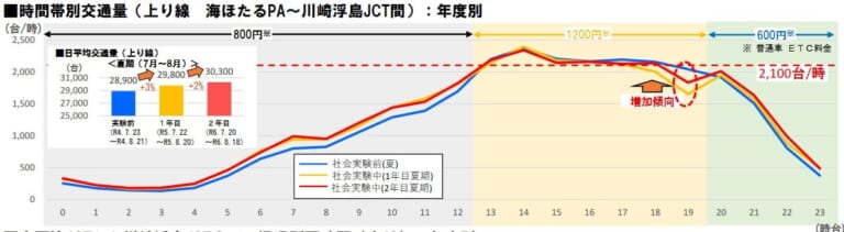 社会実験1年目の上り線海ほたるPAから川崎浮島JCT間の19時台の交通量は減少して、所要時間も減少したそうだが、2年目はその減少量が減ってきている。社会実験開始前に比べると、全体の交通量は増加傾向にあるため、さらなる渋滞対策を講じようとしているのだろう。