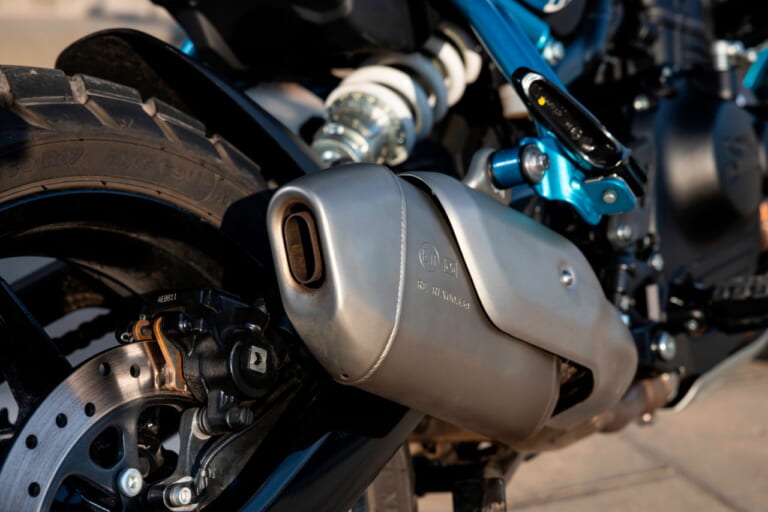サイレンサーは超コンパクトでスリム。この手前にボックス形状の触媒を設けている。マスの集中を促進させた設計で、これがハンドリングを向上させる。