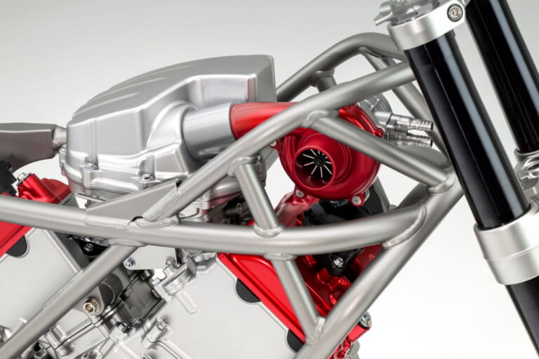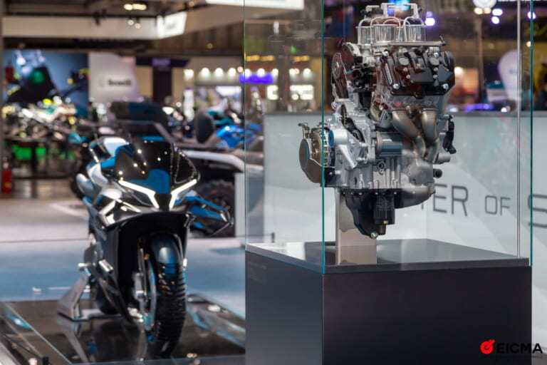 EICMAで発表されたV型3気筒エンジンは、二輪車世界初の電動過給機付き。エンジン回転数にかかわらず、任意に過給をコントロールできるため低回転からレスポンスのいいトルク特性を実現。燃費の向上にも寄与するという。インタークーラーが不要の設計とすることでマスの集中化と軽量化にも貢献しているという。大型二輪車向けに開発中という以外、スペック等は一切公開されていないが、どんなバイクに搭載されるのか、いまからワクワクする。