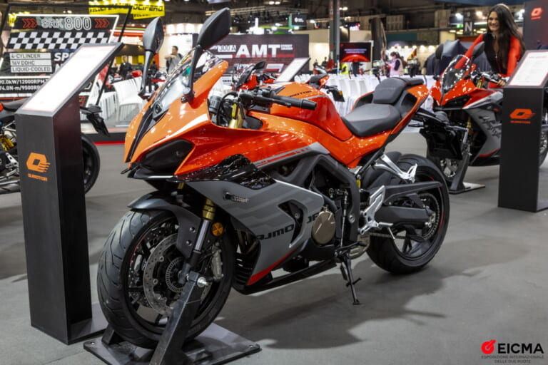 左はCFモトがEICMAで公開した、最高出力212psを発揮するというV型4気筒997ccエンジン(プロトタイプ)。搭載されるバイクは、大型ウイングレットを備えたスーパースポーツスタイルだ。右のフルカウルスポーツモデルは、QJモーターのSBK800RR(発売中・価格は9999ユーロ)。778ccの水冷4気筒エンジンは95psを発揮する。これら中国メーカー製の4気筒モデルの台頭に、ホンダも黙ってはいられない。