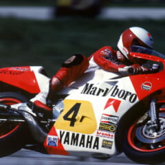 Kenny Roberts/1951年12月31日生まれ アメリカ出身 ヒザ擦りハングオフを筆頭に、スリックタイヤの導入など現代のロードレースで一般的となったライディングスタイルを確立したのがケニー・ロバーツだ。AMA(全米モーターサイクル協会)グランドナショナル選手権において’73年当時で史上最年少の21歳でチャンピオンとなった成績を皮切りに、デイトナ200マイルレースで3度の優勝(’78年、’83年、’84年)のほか、WGP500でもデビュー後3年連続チャンピオンという偉業を達成し、日本でもケニー・ロバーツのファンになったライダーは多い。’83年のWGPはフレディ・スペンサーの台頭により激闘を繰り広げ、2ポイントの差で2位に甘んじ、その後WGP引退を宣言。以降はチーム監督や後進を育てる指導者として手腕を発揮している。