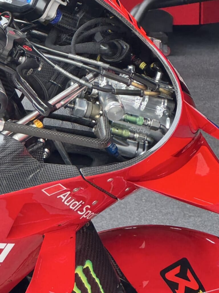 ドゥカティのファクトリーマシンは、フロントカウル内側にでっかい装置が取り付けられていた。どうやらライドハイトデバイス(RHD)の制御に使われているようだ。MotoGPでは足まわりの電子制御化が認められていないため、恐らくは油圧とサーボモーターなどが用いられているのだろう。サテライトチームのマシンには装着されていなかった。