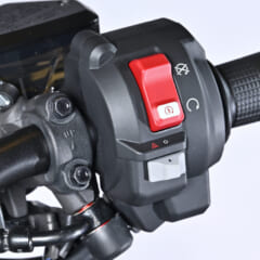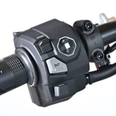 【機能的な4Wayスイッチ】ハンドルスイッチは左右ともホーネットと同じ。右側にハザード、左側にLED照明付きの4方向スイッチ&モード設定ボタンを備える。ホーネットと同じくスマホをブルートゥース接続できるハズだ。