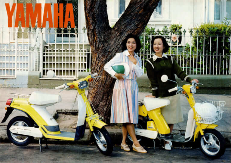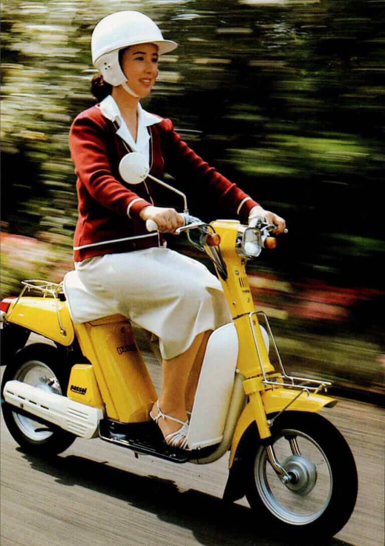 ホンダのロードパルの大ヒットを受け、ヤマハが1977年に発売したパッソル。スカートでも乗り降りしやすいステップスルーにより、両足を揃えて乗れる魅力をアピールして大ヒット。メカ部分を覆ったソフトなイメージで現代流のスタイルを築いたと言える。宣伝には女優の八千草薫さん(姉妹車のパッソーラは水沢アキさん)を起用していた。