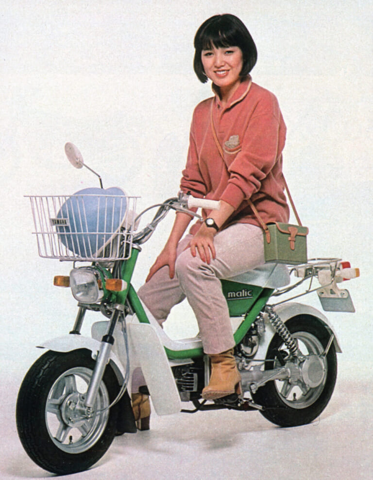 当時の原付業界は市場が大きかったので、宣伝には芸能人がバンバン登場した。1979年発売のヤマハ・マリックに跨がるのは、女優の桃井かおりさんだ。