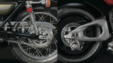 こちらのスイングアームの理論と歴史を追った記事をチェック。バイクの後輪を支える「スイングアーム」は、その変形が操縦性を大きく左右する重要部品。1970年代の単純な鉄製丸棒から、1980年代には高出力化に対応し、角形や軽量なアルミ製へと進化した。近年では、適切に“しならせる”ことで旋回性を高める考え方が主流となっている。