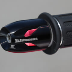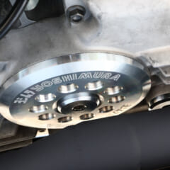 【黒いがチタン! 機械曲ストレートサイクロン】排気ポートから徐々にエキゾーストパイプ径が太くなるコニカルヘッダーや、ぱっと見は4-1に見える4-2-1集合方式など、凝った構造を満載するフルエキゾースト機械曲ストレートチタンサイクロン4-2-1(39万3800円)。2ピース分割構造でオイル交換などの整備性にも配慮する。ヨシムラEWCレーサーと同じ赤を採用したというエンブレムも新作だ。