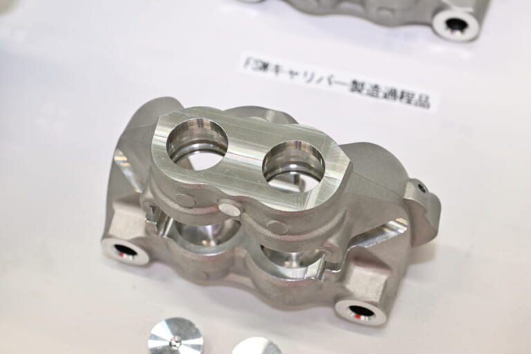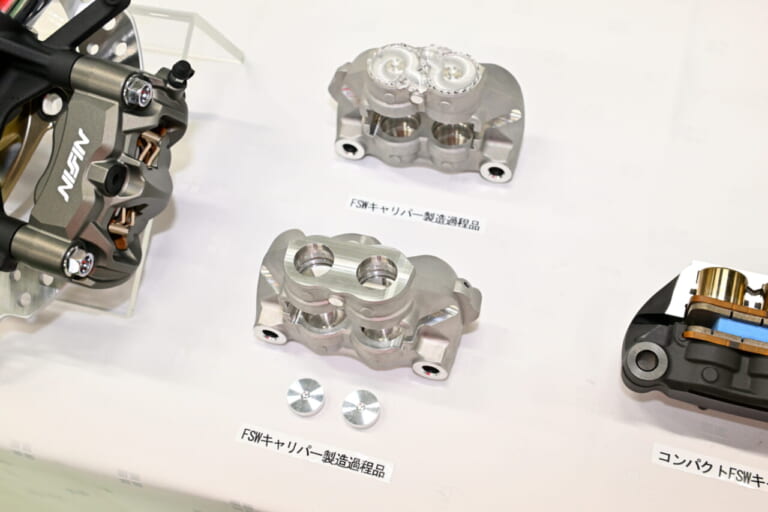 NISSINブランドのキャリパーを展示。次期モトクロッサー向けという開発中のキャリパーも。剛性アップと軽量化を追求しているという。このほか廉価なABSユニットなども展示された。