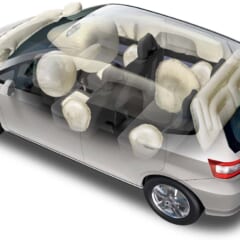 豊田合成が行ったエアバッグの衝突試験は、車輪の付いた治具の上にバイク(ホンダのフォルツァのように見える)を固定して衝突する試験車両に向かって走行させ、途中でバイクのみ治具から外してそのまま試験車両にまっすぐに衝突させてエアバッグを展開させた。エアバッグはハンドル周辺に収納されていたという。