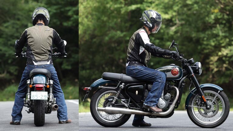 ライディングポジションは旧車の雰囲気に準じたアップライトなもので、上半身は直立に近い。丸みのある燃料タンクはニーグリップがしやすい。シート高780mmは低めの数値だが、座面が左右にやや広いので小柄な方は購入前に要チェックだ。【身長183cm】