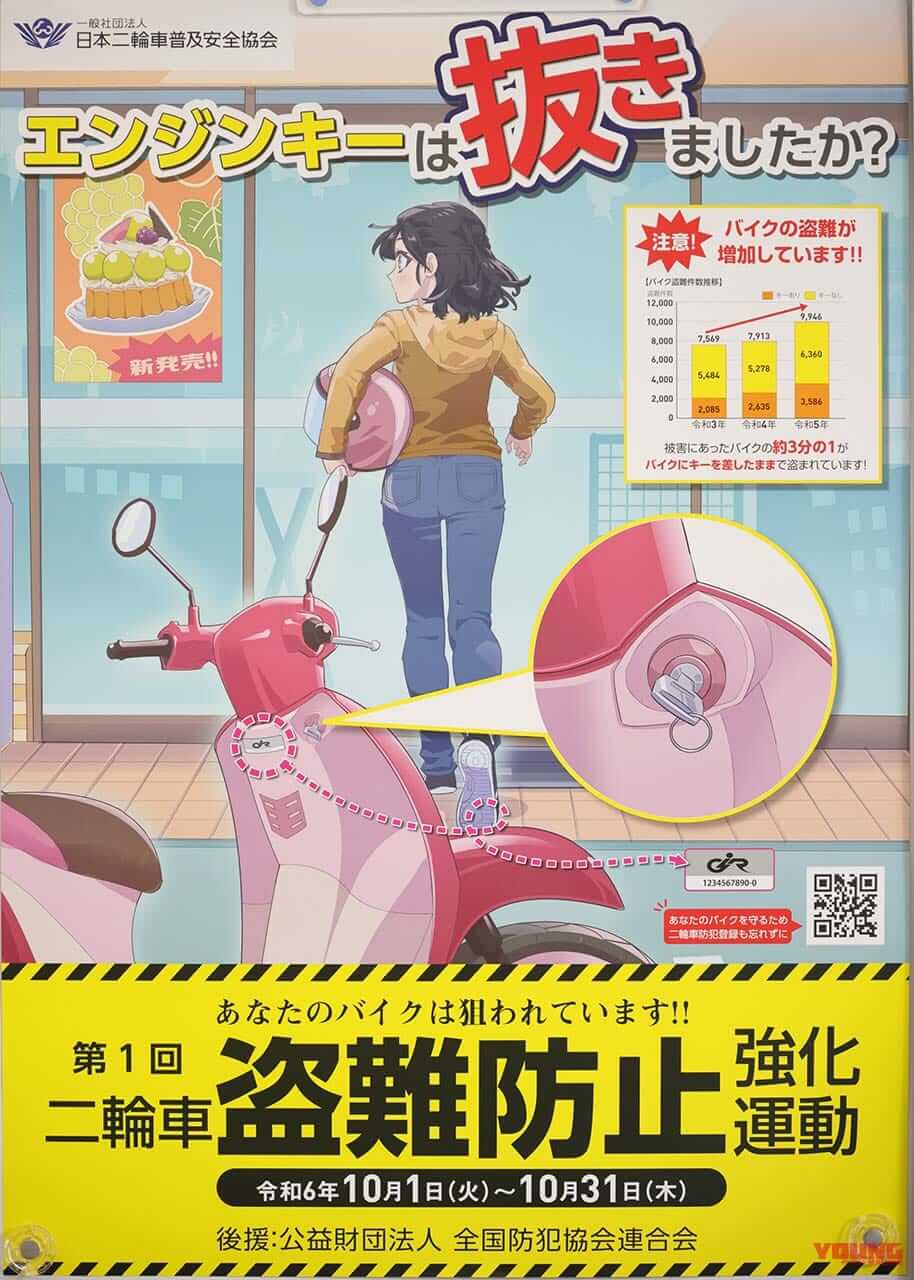 日本二輪車普及安全協会(通称:二普協)は安全本部防犯推進部を以前から設けており、2024年10月1日~31日には盗難車を捜索する際に非常に有効な「防犯登録」サービスの加入率向上を目指して「二輪車盗難防止強化月間」を実施した。