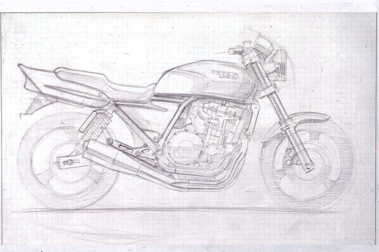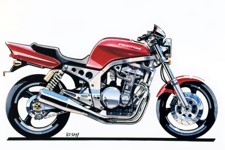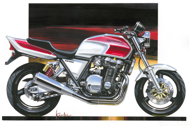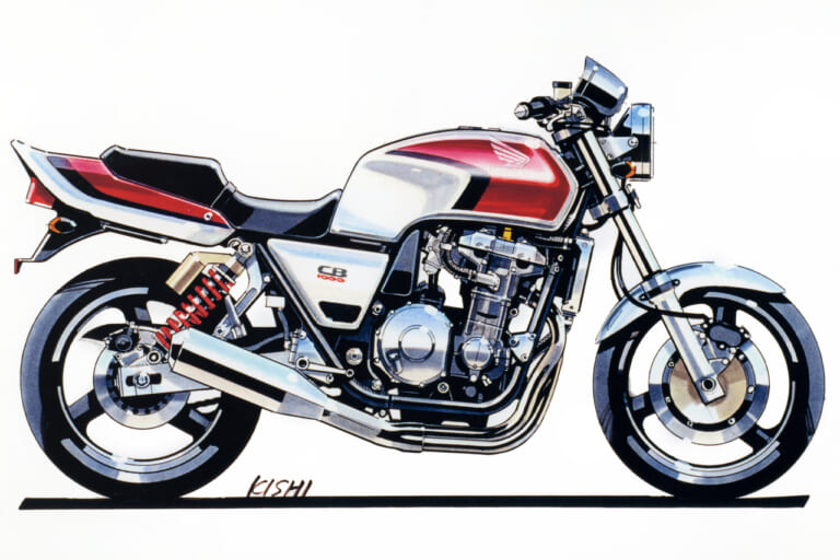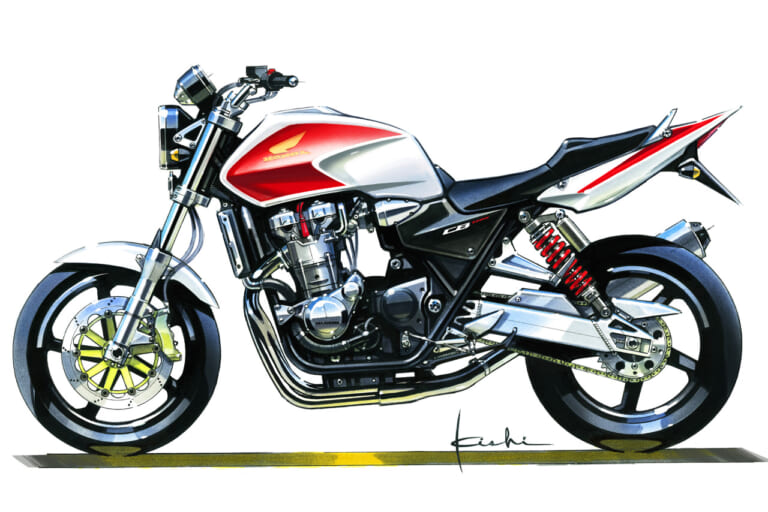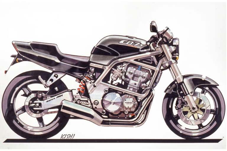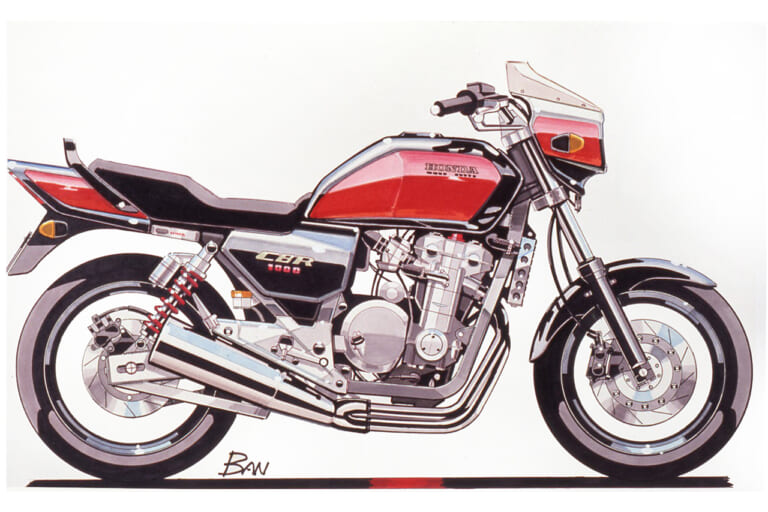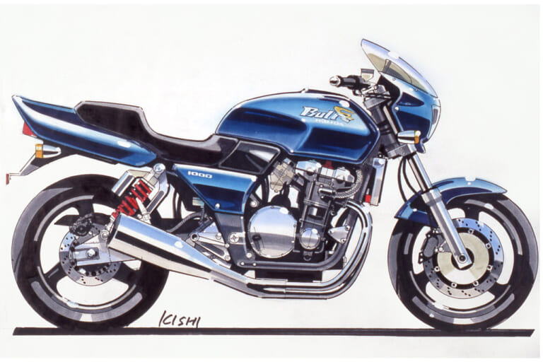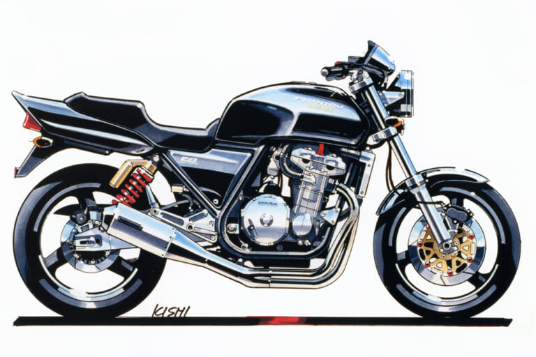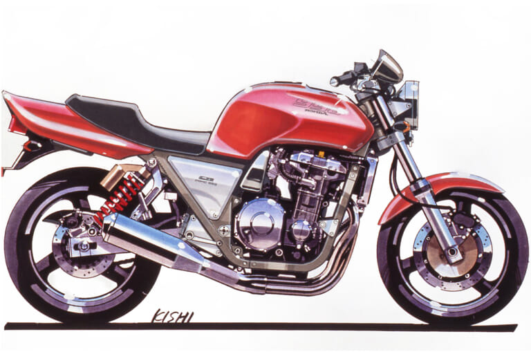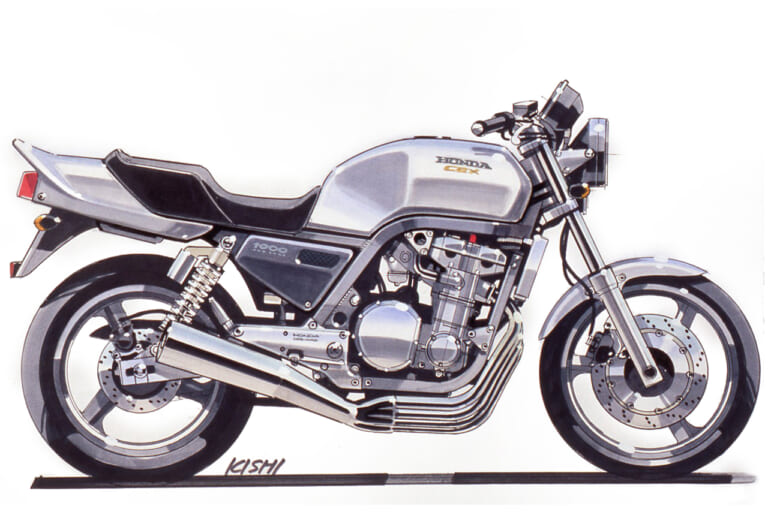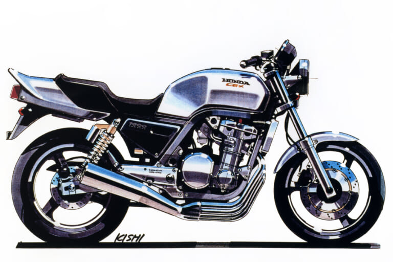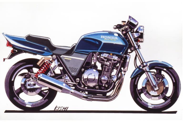 それにさかのぼること2年前の’89年頃、デザイナーの岸敏秋さんは当時、第三京浜のパーキングに集まる大排気量のカスタムマシン群にホンダ車がないことにモヤモヤした思いを抱いていた。当時のホンダは’80年代からスタートしたV4戦略の真っただ中で、CB750フォア、CB750/900Fから続いていた並列4気筒を積むスポーツバイクの流れは途絶えていたのだ。