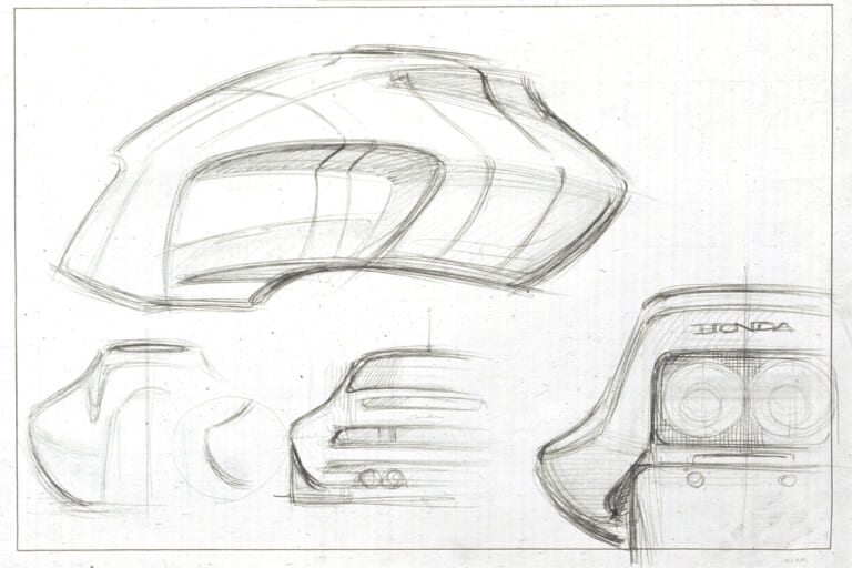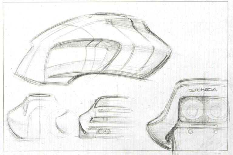 CB1000SFの燃料タンクやテールカウルなど、部分のアイデアスケッチ。ポルシェ911が描かれているのに注目!