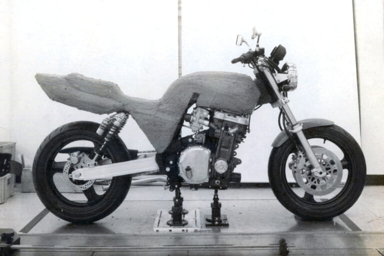 そこで、デザイン部門からのボトムアップ提案の形で、CBR1000Fのエンジンを用いたネイキッドスタイルのクレイモデルを作り始めた。大きなエンジン。それに見合う巨大な燃料タンク、スポーティなシートカウル……。岸さんの中にあるホンダらしさ、岸さんにとっての“CBの刷り込み”が具現化されていた。
