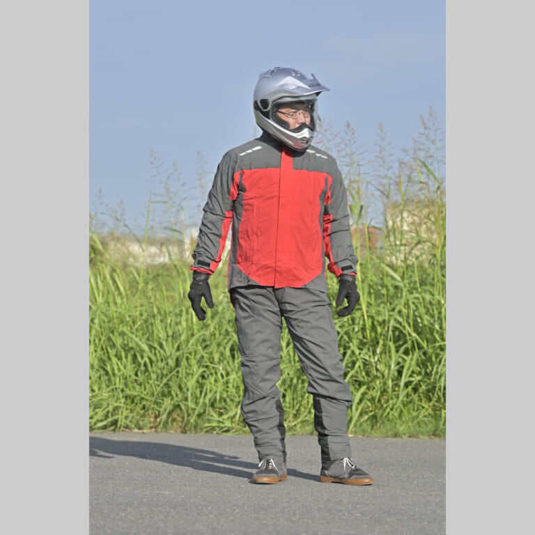 「ROM(ロム/レッドバロンのオリジナルバイクギアブランド)」ライディングレインスーツの面白いところは、耐水圧20,000mm、透湿度20,000g/ m2・24hという透湿防水性能を持ちながら、高いストレッチ性を備えていること。