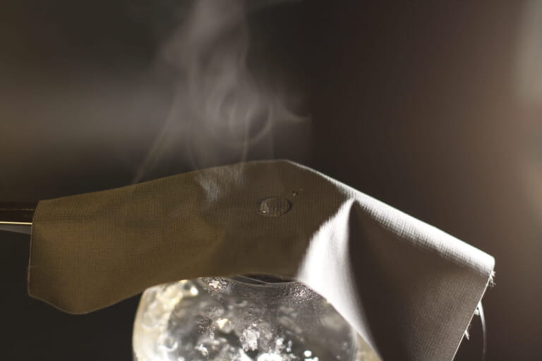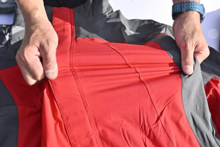 透湿性&防水性を持ちながらストレッチ性が高いことが特徴。レインウエアにありがちな、ゴワゴワ素材ではなくフィット感も高めだ。