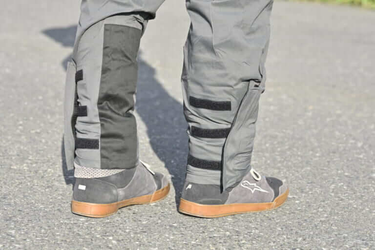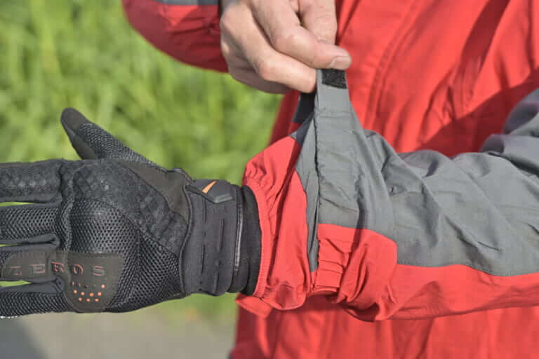 袖口はカフが2重構造になっており、グローブを伝って入ってくる雨水をブロックできるようになっている。また前傾姿勢が強めなバイクでも捲れ上がりにくいよう、後ろ側の裾はラウンド構造になっており、丈もやや長めだ。