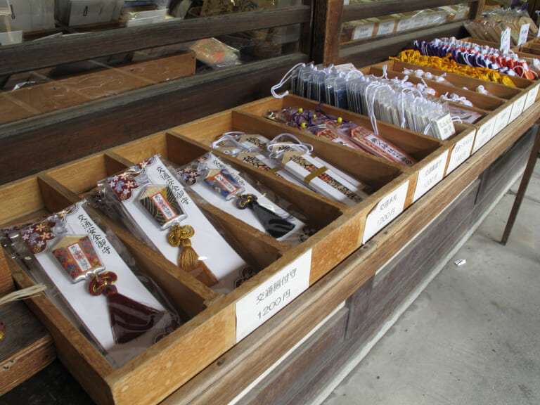 鬱蒼とした木々に覆われた参道の石段は、人によってはライディングブーツでの歩行がいささか困難かもしれませんので、履き替えようにスニーカーなどを用意しておくと万全です。秩父神社同様にオートバイ特化の御守りはありませんが、交通安全お守りは多彩です。