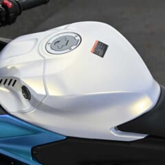 身長158cmでもカカトが少し浮く程度の良好な足着き性。燃料タンク後端とシート前端が絞られているのが効いています。意外と余裕のある車格ですが、とはいえハンドルが低すぎないので、扱いやすさを感じます。