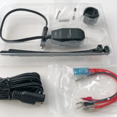 【カエディア MOTO USBチャージャー KDR-M3C】USB電源本体/ベースマウント/SAEハーネス/変換ハーネス/ヒューズ/結束バンドがセットになっています。