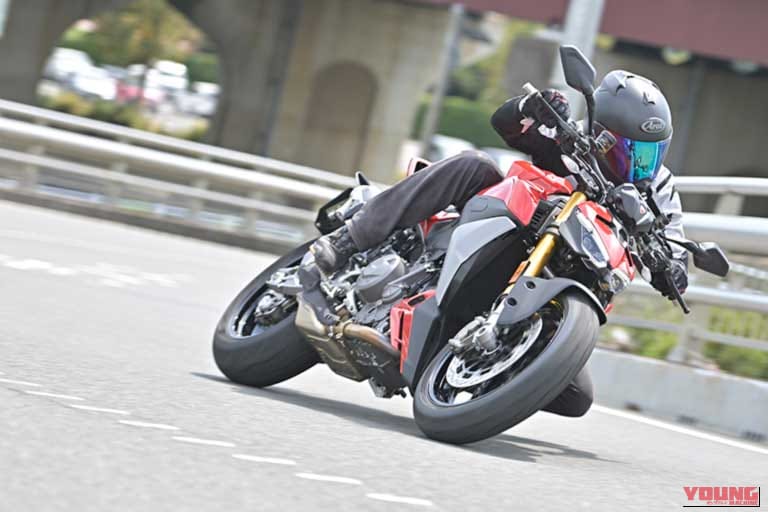 ストリートファイターV2シリーズのハイライトは、やはり新設計のV2エンジンにある。旧型比-9.4kgのシェイプアップを行うと共に、シリンダーレイアウトを20°後傾させるなどで前後長をコンパクト化。これによりフロントタイヤを車体側へより近づけることが可能となった。実際、跨ってみるとハンドル幅こそドゥカティのネイキッドらしいやや広めのポジションなのだが、ハンドル位置を含めフロントタイヤが車体中心に近く、フロント荷重重視の現代的なコーナリングがしやすい。