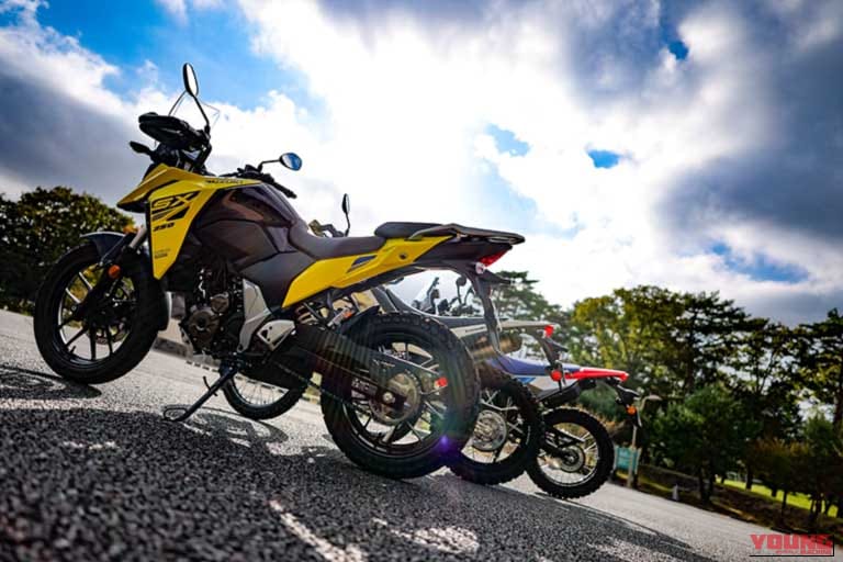 油冷単気筒のVストローム250SXと水冷並列2気筒のVストローム250を併売。クチバシデザインこそ共通だが、後者は前輪17インチ径でよりゆったりしたロードツアラーに。