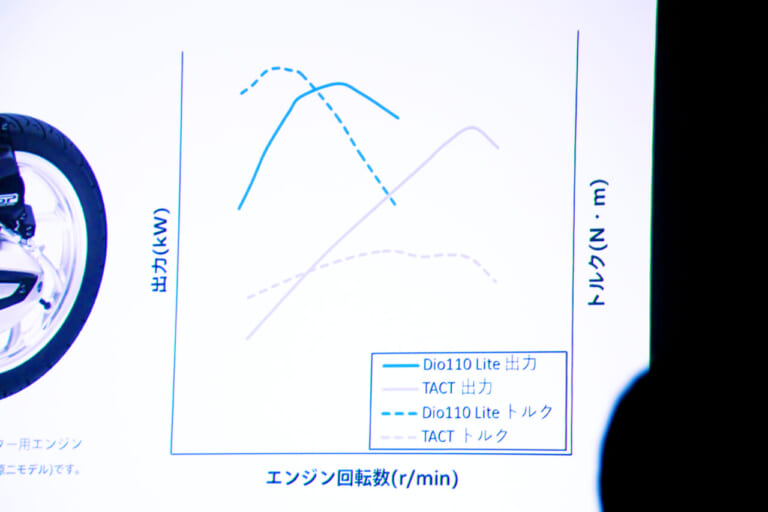 ホンダの50ccガソリン原付「タクト」と新基準原付「Dio110 Lite」のエンジン性能曲線の比較。同じ出力を発揮する際のエンジン回転数は新基準原付のほうがかなり低く、トルクにいたっては段違い。新基準原付のエンジンは本来の設計寿命よりも長く使える可能性が高い