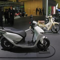 ジャパンモビリティショー2025のホンダブースにも新基準原付モデルや電動モデルが展示され、多くの来場者が車体にまたがって、その感触を確かめていた。